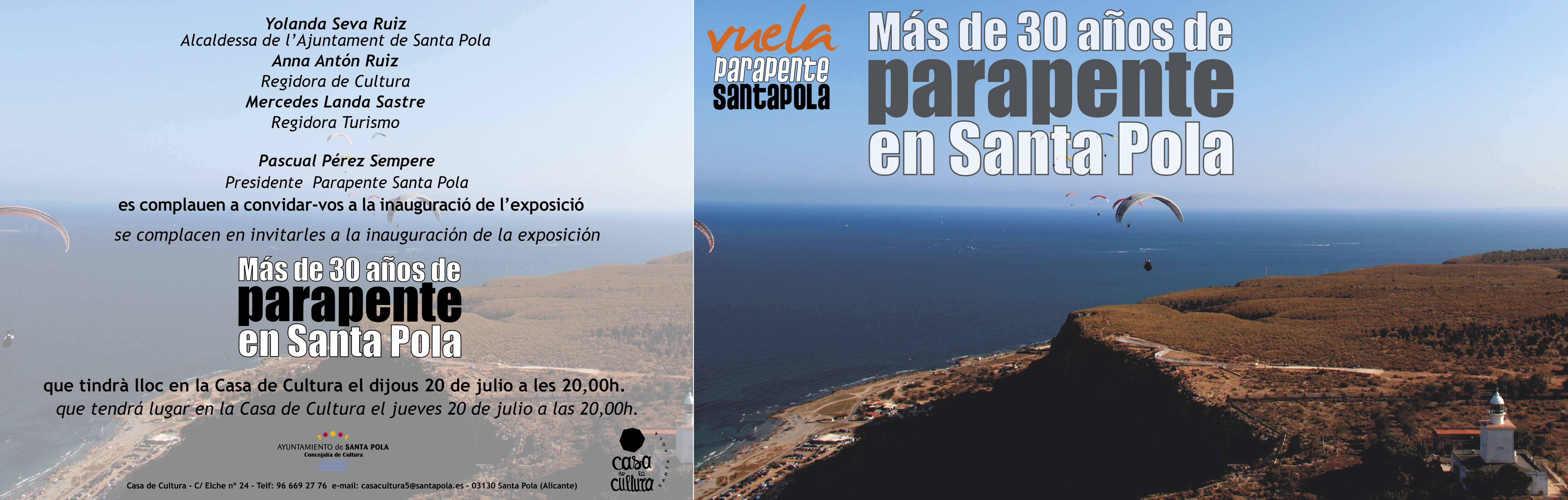Mañana jueves 20 de julio a las 20:00 h. se celebra en la casa de Cultura de Santa Pola, la inauguración de la exposición de fotografía "Más de 30 años de Parapente en Santa Pola". Esta inauguración, es la antesala de la exposición que se podrá visitar desde el día 20 de Julio al día 9 de Septiembre, en horario de Lunes a Viernes de 9,30 h. a 13,30 h. y de 16,30 h. a 21,30 h., en la Sala de Exposiciones de la Casa de La Cultura de Santa Pola.